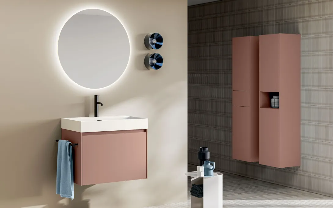 Moderner Waschtisch mit roséfarbener Front, weißem Aufsatzbecken und rundem LED-Spiegel kombiniert mit passendem Hochschrank in zeitloser Badgestaltung von Stocco.