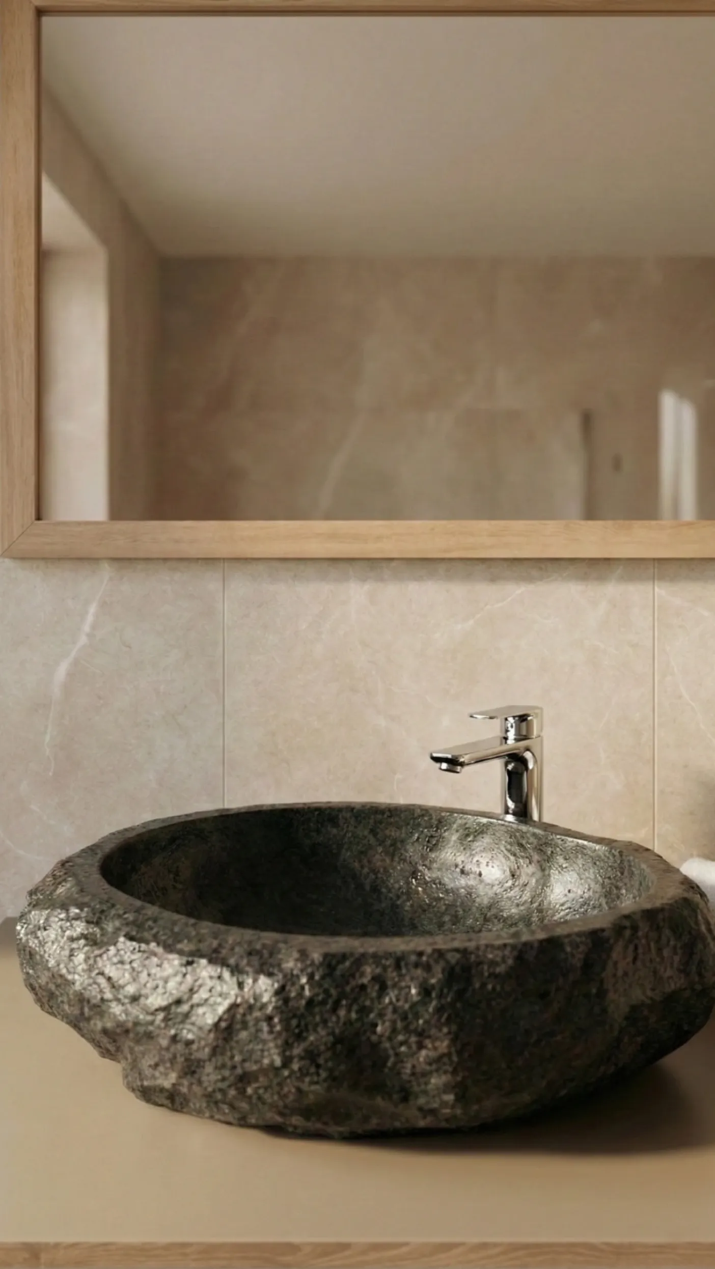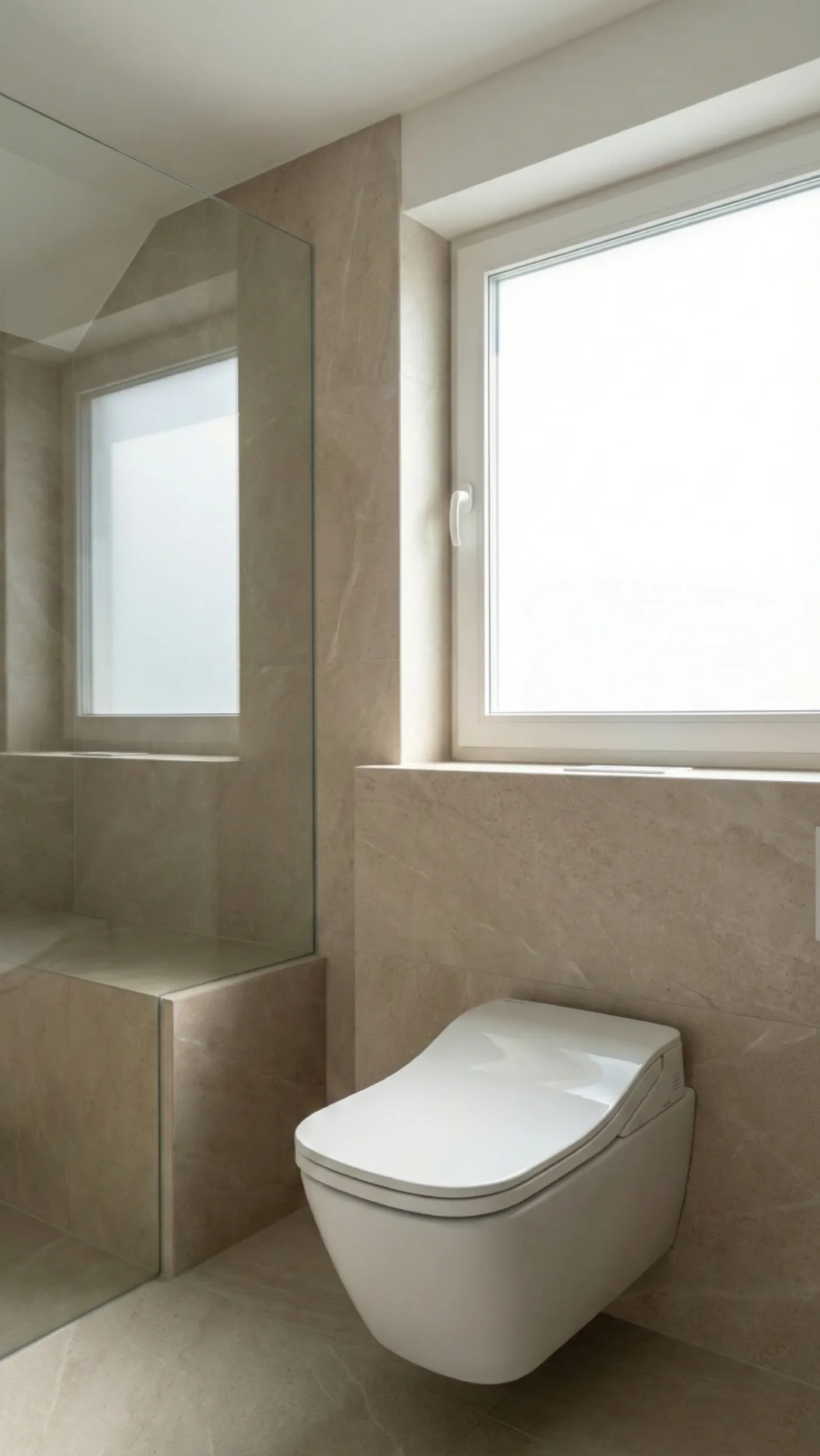 Dieses Badezimmer steht für eine ruhige, hochwertige Badgestaltung mit klarer Formensprache. Natürliche Materialien, helle Steinflächen und warmes Holz schaffen ein harmonisches Ambiente, das Komfort und Entspannung in den Mittelpunkt stellt.