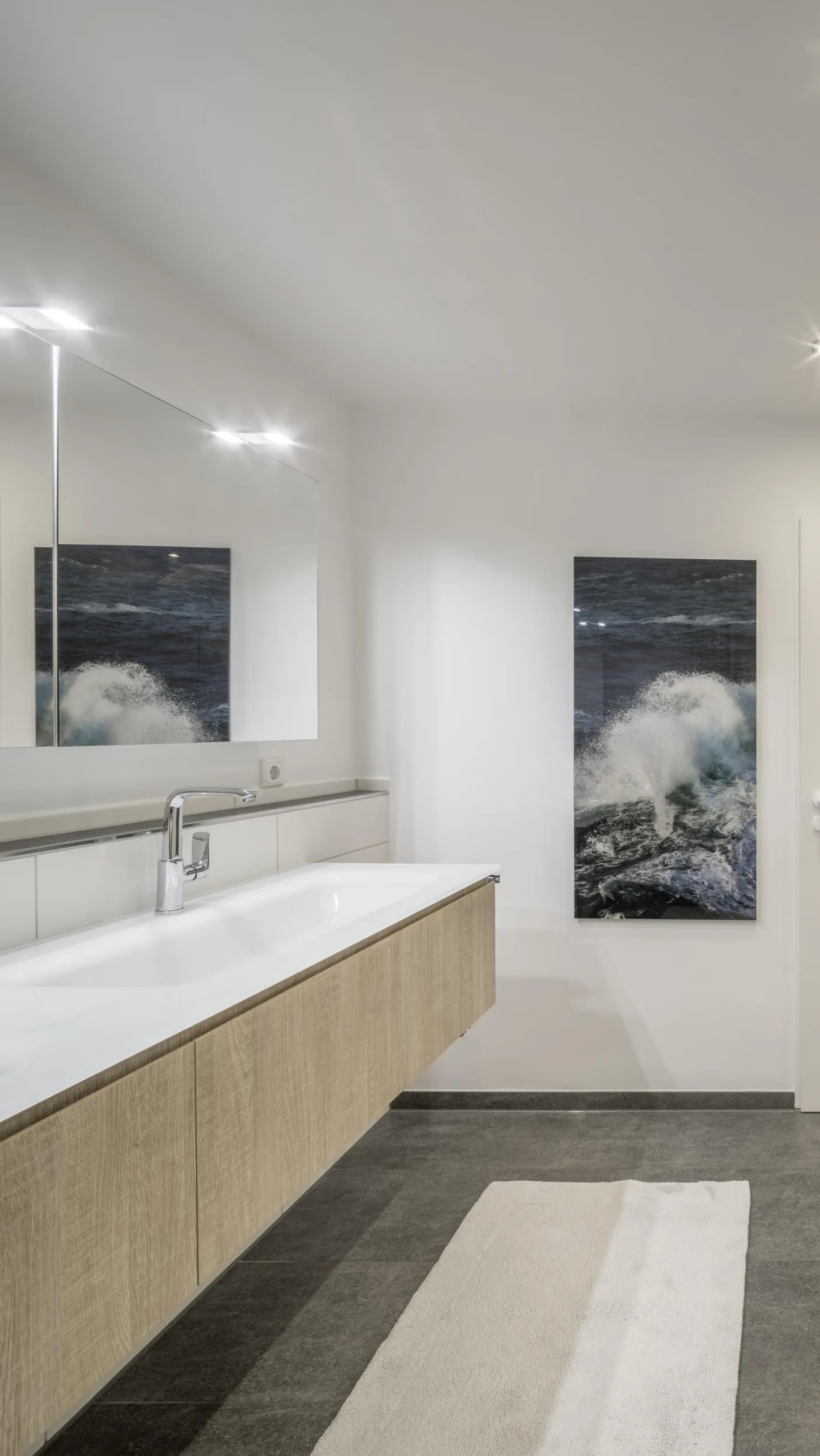 Die hellen Badezimmermöbel, in Kombination mit den dunklen Fliesen, bringen eine wohnliche Atmosphäre in den Raum.